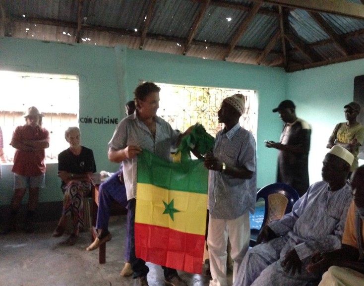 Au nom des Voiles du Partage et avec la complicité de Yves, notre trésorier et grand maître d'œuvre de l'action AHI sur la Casamance, Christian, après avoir transmis le drapeau de la Mauritanie (escale précédente des Voiles du Partage) au Chef du village