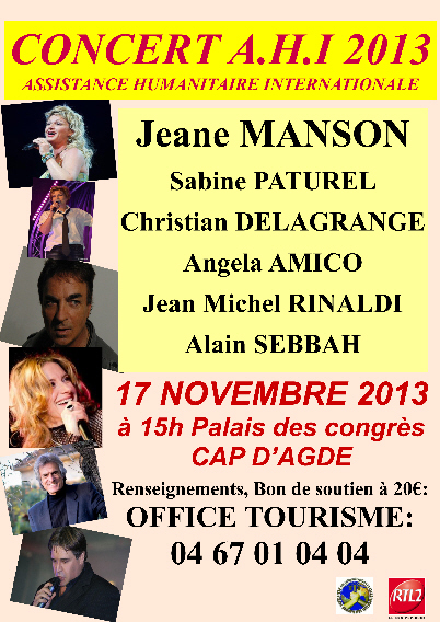 Encore un grand moment de spectacle, de solidarité, de générosité que fut ce concert A.H.I du 17 novembre 2013. Près de 570 spectateurs ont d’abord pu assister au compte rendu des actions d’A.H.I en 2013, puis les artistes ont offert une magnifique après midi à un public ravi et chaleureux. Un mélange savoureux d’humour, de souvenirs, de moments graves, de nostalgie, et surtout de beaucoup d’amour. Cette édition A.H.I 2013 augure déjà de ce que sera A.H.I 2014 puisque ce rendez-vous annuel devient un évènement marquant de la station de Cap d’Agde, en une période ou les touristes sont déjà rentrés chez eux. Grâce à la recette conséquente de ce spectacle c’est la moitié du coût de la réalisation de l’orphelinat au Bénin qui est financé. Merci à la mairie d’Agde, RTL2, l’Office du tourisme de Cap d’Agde, le personnel du palais des congrès. Merci aux organisateurs, militants d’A.H.I, techniciens, et artistes, tous bénévoles, pour cette réussite. Merci à vous fidèles amis de A.H.I de nous avoir honoré de votre présence. A l’an prochain.